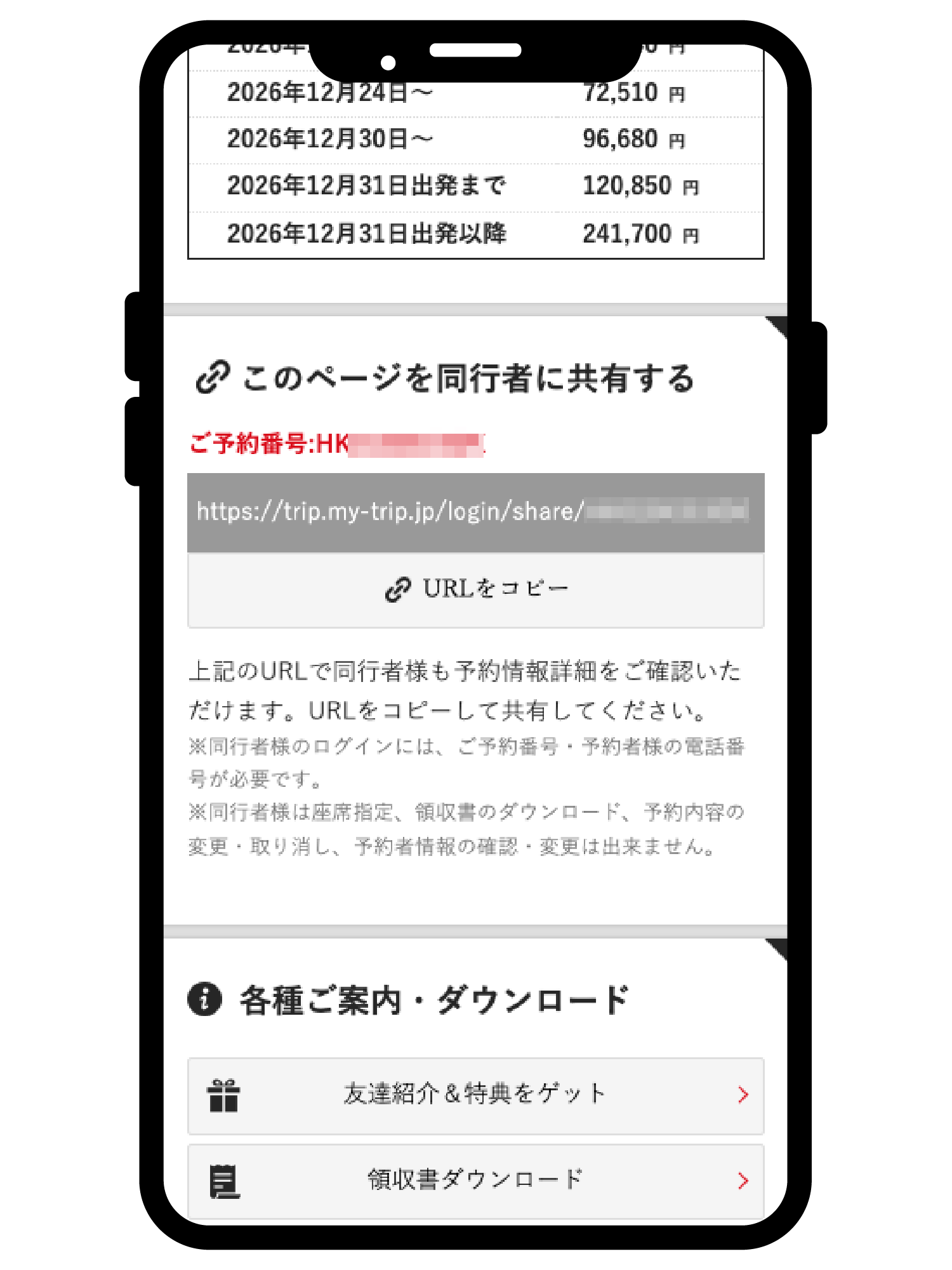 ※同行者がMY-TRIP(マイページ)にログインする際は、予約番号と予約者の電話番号が必要となります。